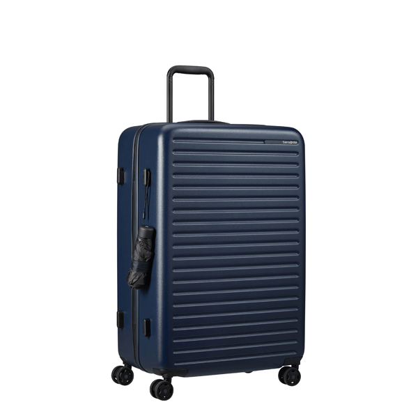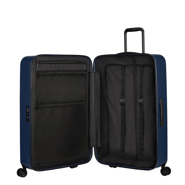 Quatre roues jumelées à flux d’air Spinner pour que vous puissiez faire rouler facilement une valise verticale.