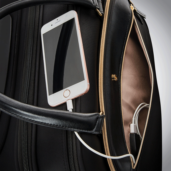 Special power hub includes a USB port and a pocket sized for wireless charging*. *Battery not included