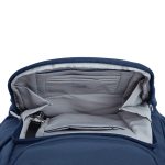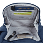 Top load backpack has padded sleeve for tablet or laptop up to 13″, slip pocket and zippered pocket