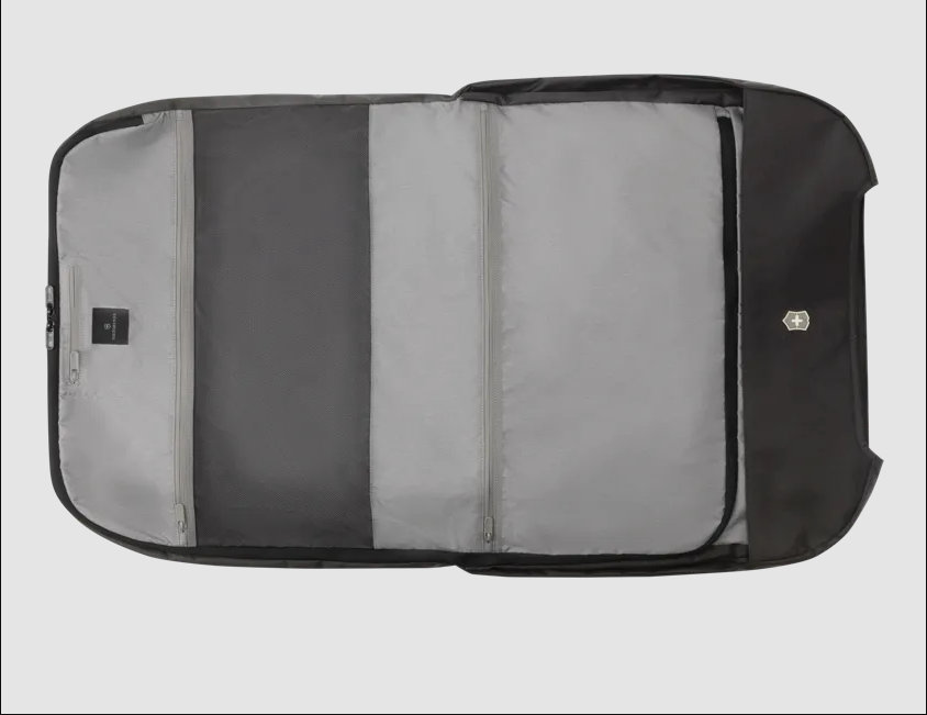 Interior features: hanger clamp, foam bolster compression strap, large zippered mesh storage pocket and large zippered lining pocket